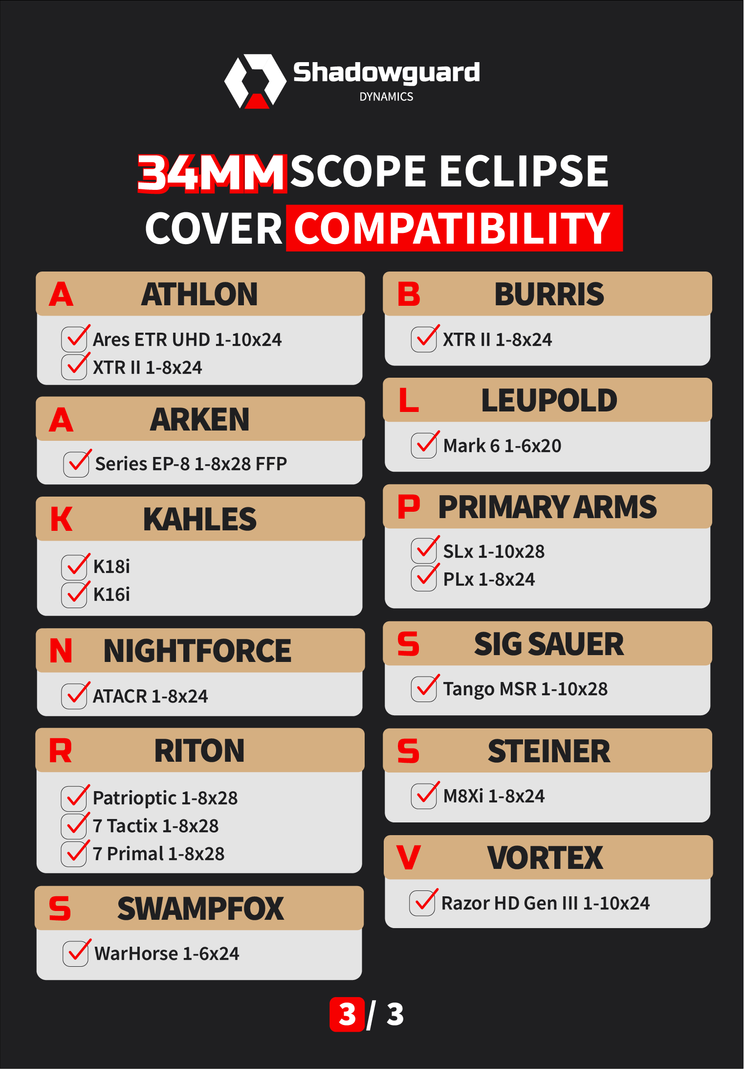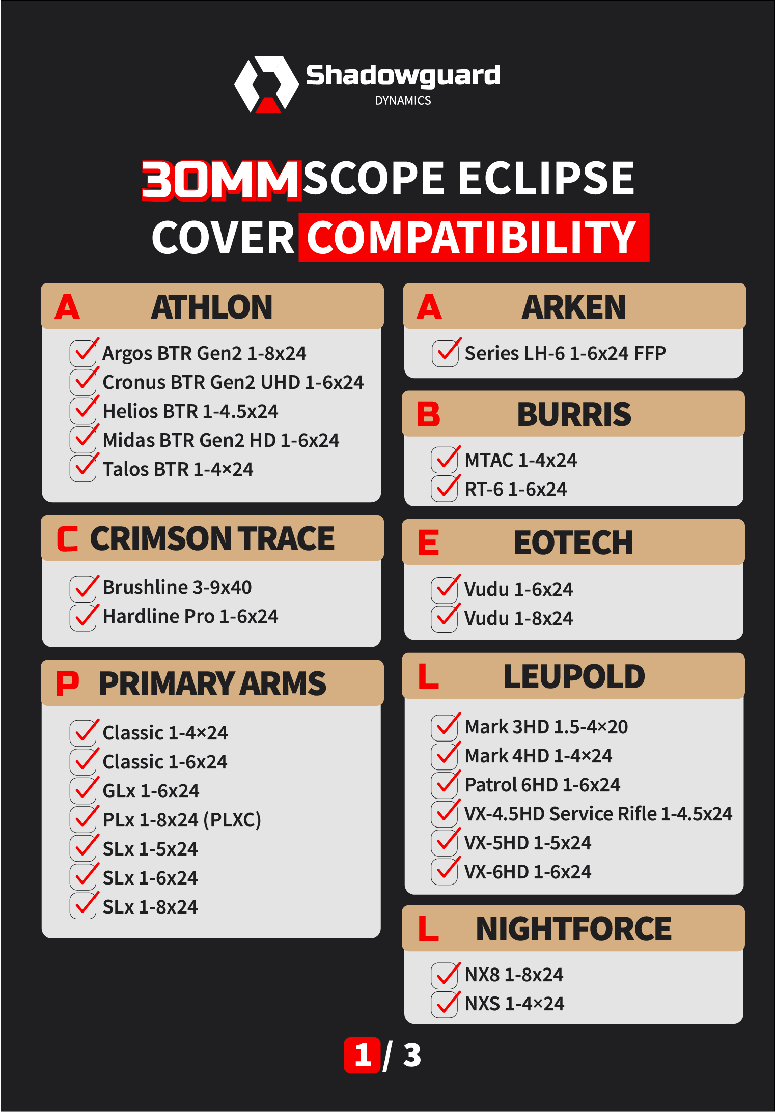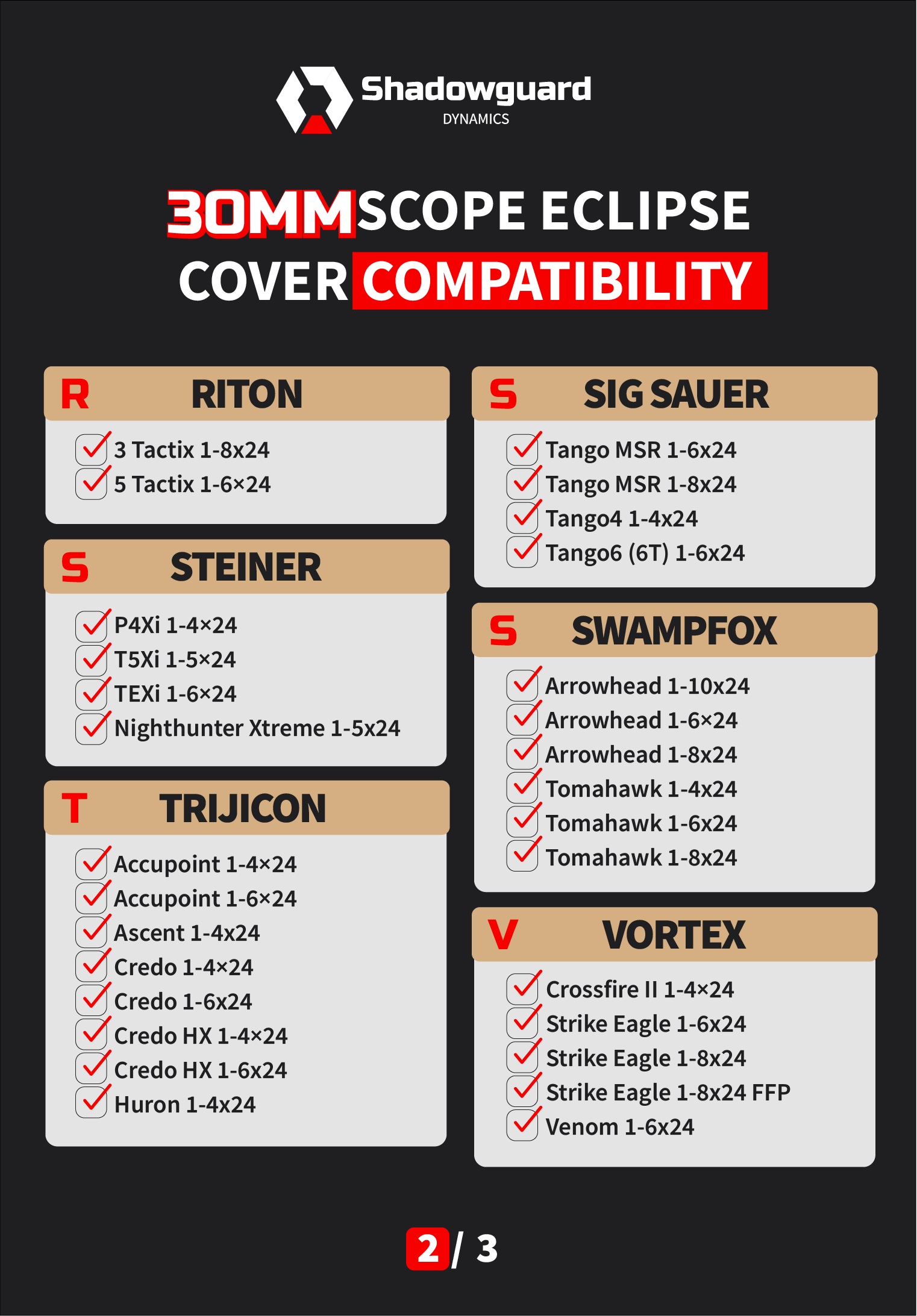 The Eclipse Cover comes in multiple sizes to fit a wide range of optics. Each variant is precision-engineered for specific lens dimensions, ensuring a perfect, secure fit without any modifications. Check our compatibility guide for a full list of supported models and to find the right size for your optic.